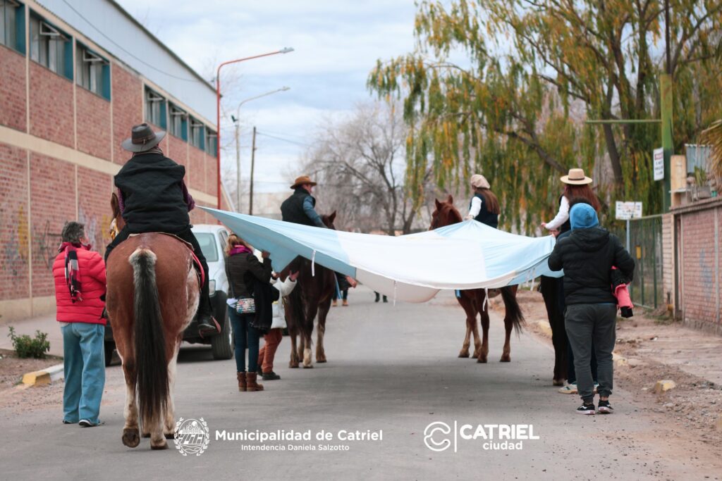 Uno de los momentos más emotivos de la jornada fue la entrega de una bandera a la Intendenta, realizada por la Asociación Kawell Anay. Este grupo, conocido por su compromiso con las tradiciones y la cultura local, realizó un significativo gesto al acercar la bandera montados a caballo, simbolizando el vínculo entre la historia y el presente de la nación.